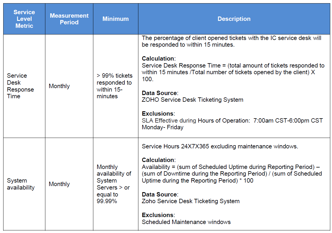 1.3 The Service Desk Response time service level metrics are effective during the IC Service Desk Hours of Operations – 7 am CST to 6 pm CST Monday through Friday.